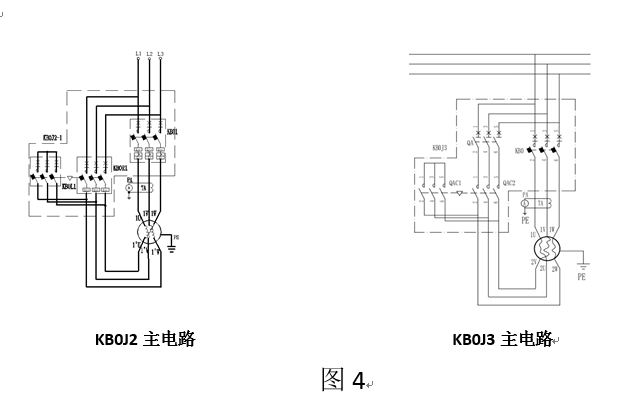 4. KB0J2、KB0J3、KB02J2、KB02J3主電路與普通KB0J、KB02J的接線方式區(qū)別是KB0或KB02主電路接線位置,普通的KB0J、KB02J接線方式:接在電源進(jìn)線端主電路KB0承受的是線電流In。而采用圖4(KB0J2、KB0J3、KB02J2、KB02J3)分流的接線方式后,KB0或KB02主回路接的位置有一些變化,啟動完成后主開關(guān)KB0或KB02承受的是相電流In/3(見表4)。KB0J2、KB0J3、KB02J2、KB02J3全壓工作時(shí)流過每臺主開關(guān)的相電流的計(jì)算公式見表4。(電纜的截面積選擇:引至電動機(jī)端的電纜截面積承載的電流不小于分流后,流過主開關(guān)工作電流值;引至星三角減壓起動器進(jìn)線端的(進(jìn)電源端)電纜截面積承載的電流不小于電動機(jī)全壓工作時(shí)額定電流值。)