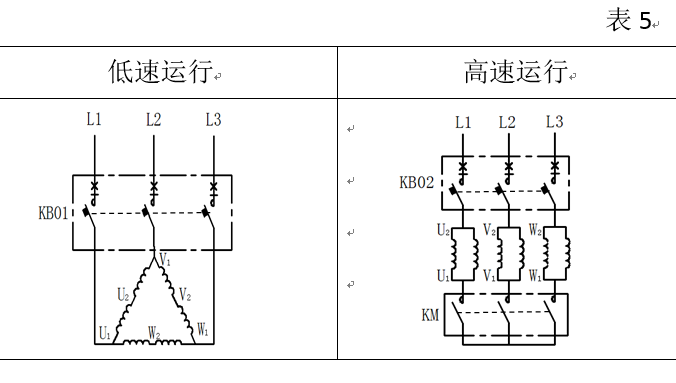 許多場合需要使用雙速電動(dòng)機(jī)如一般工業(yè)建筑、民用建筑、排風(fēng)兼排煙風(fēng)機(jī)。通常需要兩種風(fēng)機(jī)轉(zhuǎn)速分別用于正常(平時(shí)低速排風(fēng))和緊急情況(如發(fā)生火災(zāi)需要高速排煙),為此需要采用雙速控制器去控制兩種轉(zhuǎn)速的電動(dòng)機(jī)?;趦膳_(tái)KB0輔以適當(dāng)?shù)慕佑|器等構(gòu)成KB0D雙速控制器裝置,其控制雙速電動(dòng)機(jī)繞組的接線方式見表5。