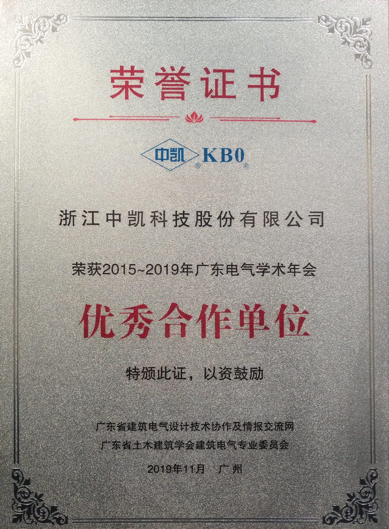 日前,在2019年廣東建筑電氣與智能建筑年會暨學術交流會上,浙江中凱科技股份有限公司榮獲2015-2019年優(yōu)秀合作單位。