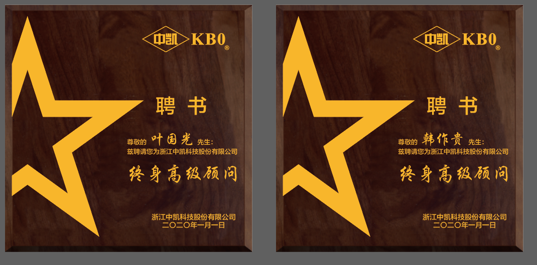 2020年5月21日,中凱科技分別向葉國光和韓作貴頒發(fā)聘書,聘請兩人為浙江中凱科技股份有限公司終身高級顧問。