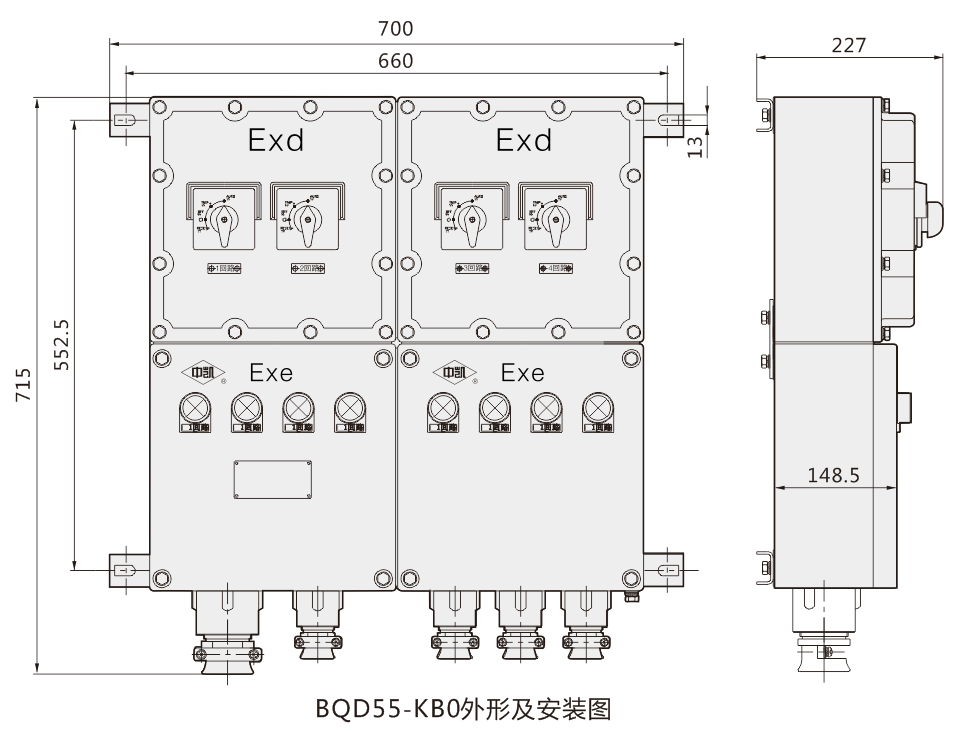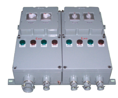 BQD55一KB0防爆控制與保護(hù)開關(guān)箱(以下簡(jiǎn)稱開關(guān)箱)適用于ⅡB級(jí)T6組及以下級(jí)別、組別的爆炸性氣體混合物(1區(qū)和2區(qū))場(chǎng)所。主要用于交流50Hz(60Hz),額定電壓至400V,開關(guān)箱額定電流至180A,各分路的電流至45A的電路中,對(duì)配電電路負(fù)載的控制與保護(hù)及對(duì)電動(dòng)機(jī)不頻繁或頻繁起動(dòng)、停止的控制與保護(hù)。