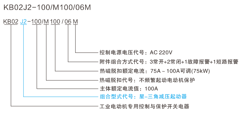 適用于電動(dòng)機(jī)星-三角減壓起動(dòng)的控制與保護(hù),以KB02產(chǎn)品作為主開(kāi)關(guān),與時(shí)間繼電器、電氣聯(lián)鎖及控制回路組合構(gòu)成星-三角減壓起動(dòng)的控制與保護(hù)裝置。
