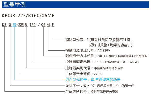 適用于電動機星-三角減壓起動的控制與保護,以KB0產(chǎn)品作為主開關(guān),與塑殼斷路器、可逆接觸器、時間繼電器、電氣聯(lián)鎖及控制回路組合構(gòu)成星-三角減壓起動的控制與保護裝置。