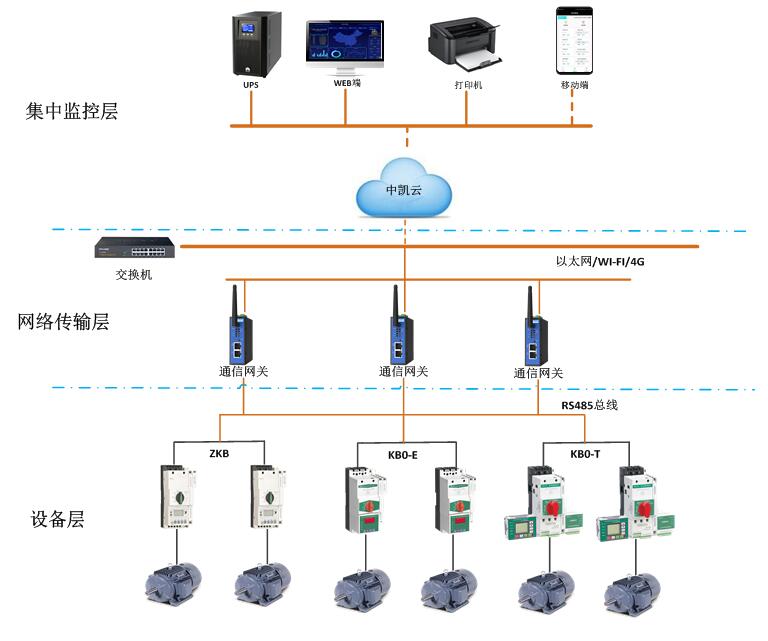 基于中凱物聯(lián)網(wǎng)云平臺的電動機(jī)智能監(jiān)控系統(tǒng),以可通訊KB0作為電機(jī)控制與保護(hù)的核心元件,并實(shí)時采集電動機(jī)數(shù)據(jù)包括:實(shí)時電流、實(shí)時電壓、故障信息、整定參數(shù)等,通過中凱智能網(wǎng)關(guān)上傳至中凱云平臺。