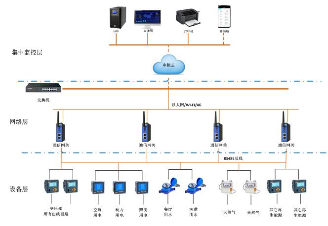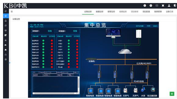 中凱能耗監(jiān)控系統(tǒng)基于中凱云平臺(tái),現(xiàn)場(chǎng)能耗監(jiān)測(cè)設(shè)備進(jìn)行能耗數(shù)據(jù)采集,通過智能網(wǎng)關(guān)組網(wǎng),將數(shù)據(jù)上傳至中凱云平臺(tái)。web端及移動(dòng)端app通過訪問云服務(wù)器同步數(shù)據(jù),監(jiān)控系統(tǒng)實(shí)現(xiàn)數(shù)據(jù)監(jiān)測(cè)、分析、評(píng)估等功能。